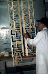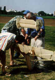 Das Verkleben der Spanten, Holme und Beplankungen erfolgte in traditioneller Weise mit Weißleim auf einer Helling unter Zuhilfenahme verschiedenster Spann- Preß- und Heftwerkzeuge.