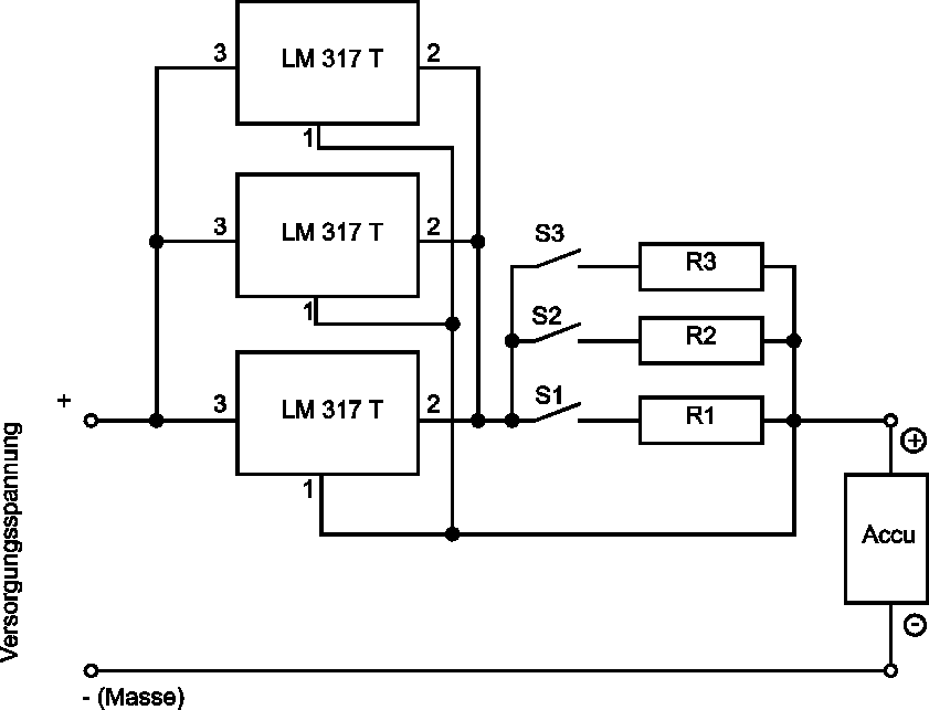 Das Herzstück der Schaltung bildet ein Spannungsregler LM 317 T, welcher durch die externe Beschaltung zu einer Konstantstromquelle umfunktioniert wird. Die Schaltung sieht wie folgt aus: