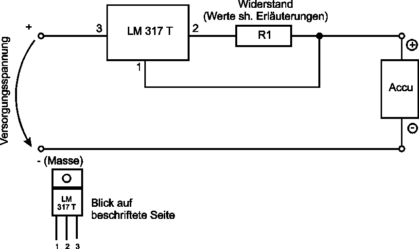Dabei ist der integrierte Spannungsregler LM 317 T das eigentlich regelnde Bauteil. Dieser erkennt den Spannungsfall am angeschlossenen Widerstand und versucht, diesen auf etwa 1,25 V zu halten.