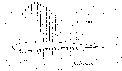 (Abb. 1.1/2; © Neckar-Verlag GmbH; ISBN 3-7883-0124-4) Zuerst zum Tragflächenprofil (kurz: Profil). Dadurch, daß bei gekrümmten Flächen – wie in der Zeichnung dargestellt - die Luft oben schneller als unten vorbeifließen muß, entsteht über der Tragfläche ein Unterdruck, unter der Tragfläche ein Überdruck. Die Tragflächen werden also – solange die Strömung der Luft „anliegt“ angehoben – und mit ihnen das ganze Modell (wie die Pfeile das verdeutlichen). Je schneller ein Modell ist und je stärker die Krümmung, desto stärker ist die Druckdifferenz zwischen Ober- und Unterseite. Leider steigt mit stärkerer Krümmung und höherer Geschwindigkeit auch der Luftwiderstand – und zwar wesentlich schneller als der Auftriebsgewinn durch den Druckunterschied. Damit ist es wichtig und von ganz erheblichem Vorteil die Oberfläche der Tragflächen so glatt als möglich zu halten und das Profil passend zum Modell – d. h. zu den anderen Bauteilen - zu wählen, damit der Widerstand möglichst klein und der Auftrieb möglichst groß wird.