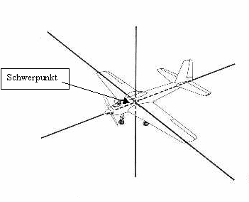 Die Achsen schneiden sich im sogenannten „Schwerpunkt“ (der dadurch eindeutig festgelegt ist!). Der Schwerpunkt (oder auch Massenmittelpunkt) eines Modells ist der Punkt, an dem eine auf das Modell einwirkende Kraft angreifen darf und das Modell bewegt sich nur geradlinig in Richtung der Kraft, d. h. es versucht nicht durch Drehung o. ä. der Kraft „auszuweichen“. Ist ein Modell „ausgewogen“ (d. h. es ist bei dem berühmten Griff unter die Tragflächen im Gleichgewicht) so sagt man es ist „im Schwerpunkt unterstützt“. Ist ein Modell nicht im Schwerpunkt unterstützt, so heißt das ganz einfach, daß der Achsenschnittpunkt und der Massenmittelpunkt verschieden sind. Die Flugpraxis zeigt welch katastrophale Auswirkungen der Start eines solchen Modells hat. Sämtliche Ruderausschläge wirken bezüglich des Achsenschnittpunktes, alle äußeren Kräfte (Wind, Schwerkraft, Motor usw.) bzgl. des Massenmittelpunktes. Sind diese nicht identisch bedeutet das beispielsweise, daß die Schwerkraft nicht durch eine äquivalente Kraft - hervorgerufen durch ziehen des Höhenruders - ausgeglichen werden kann, sondern nur durch eine (theoretische) Kraft die den Unterschied der Wirkungspunkte mit berücksichtigt. Dies ist für Anfänger in der kurzen Zeit beim ersten Start fast unmöglich zu „treffen“.