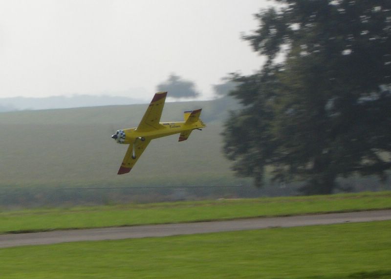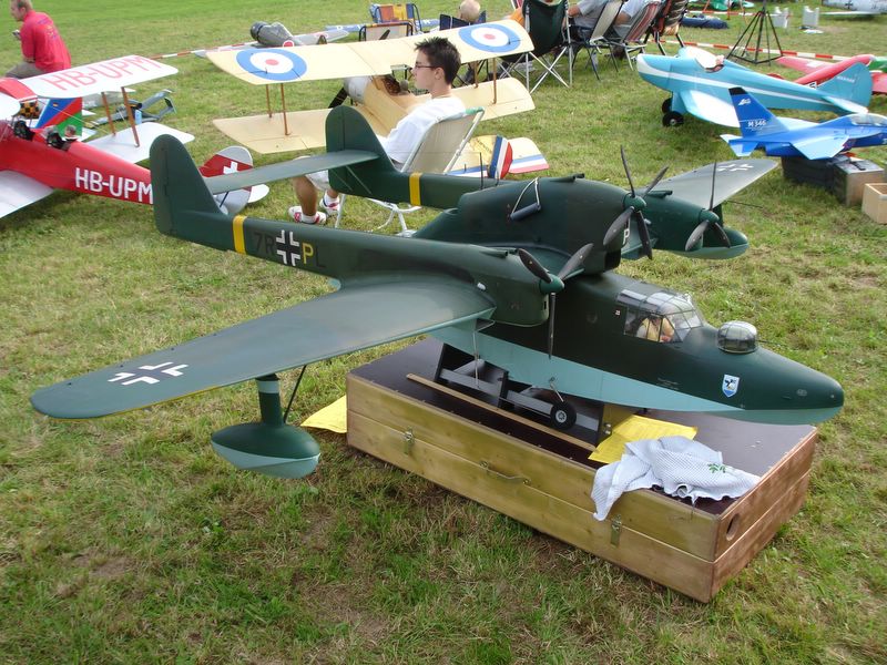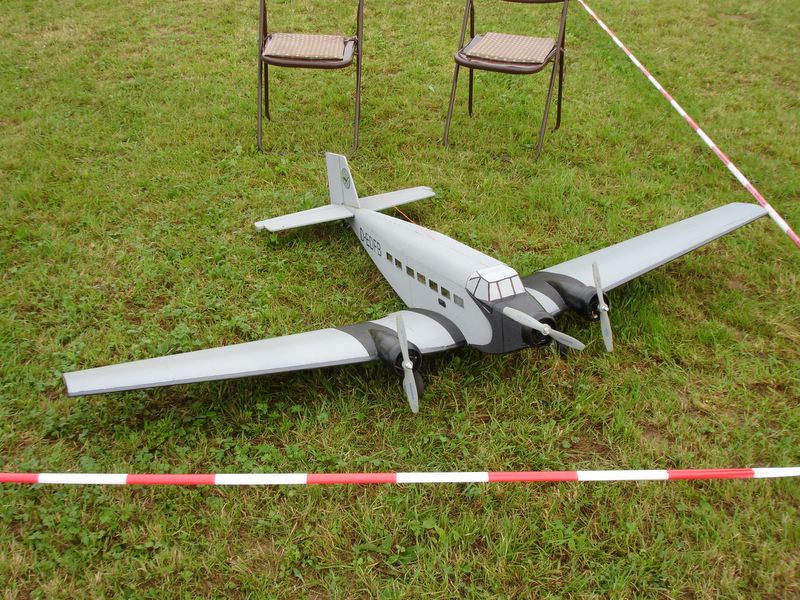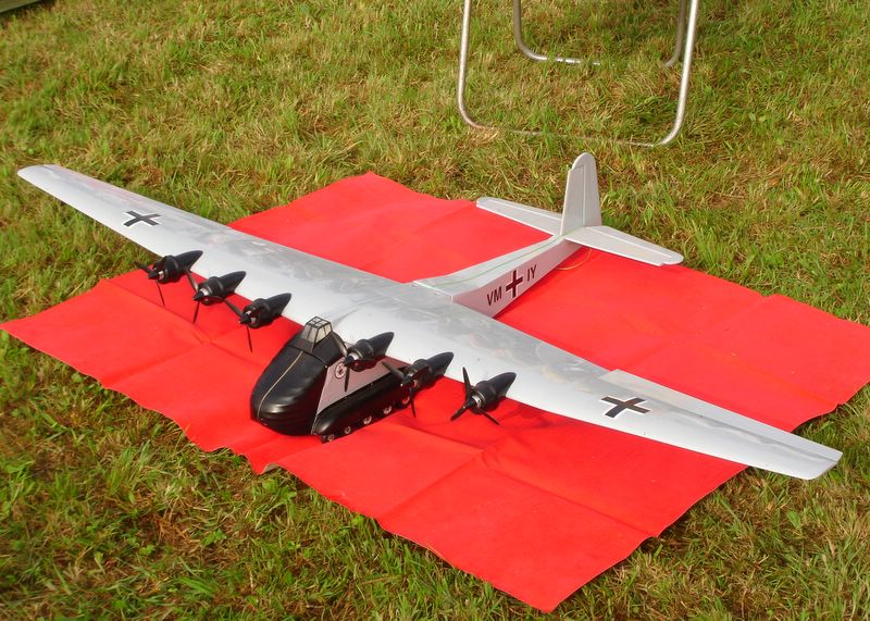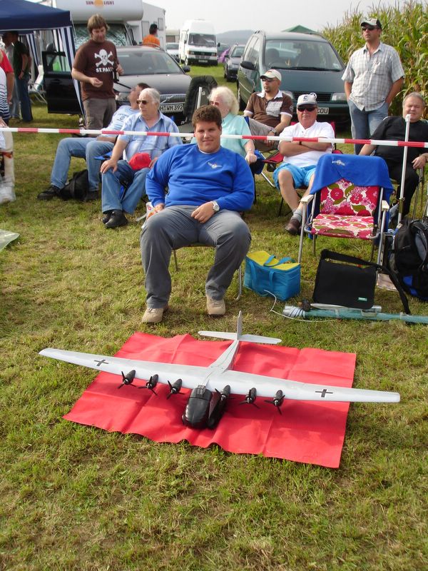 Erstmals wurde dieses Jahr ein zentraler Showblock von 11.00 Uhr bis 16.00 Uhr organisiert, in dem nur geladene Piloten fliegen durften. So war es sehr erfreulich, dass Christoph Lausberg mit seiner sechsmotorigen Me 323 Gigant eingeladen war, die Farben unseres Vereins zu vertreten. Und ich darf gleich feststellen, er tat dies sehr gekonnt und überzeugend. Schließlich ist sein Gigant, übrigens ein kaum modifizierter Graupner-Bausatz, das einzige Modell dieser Art in Deutschland, dass tatsächlich auch geflogen wird.